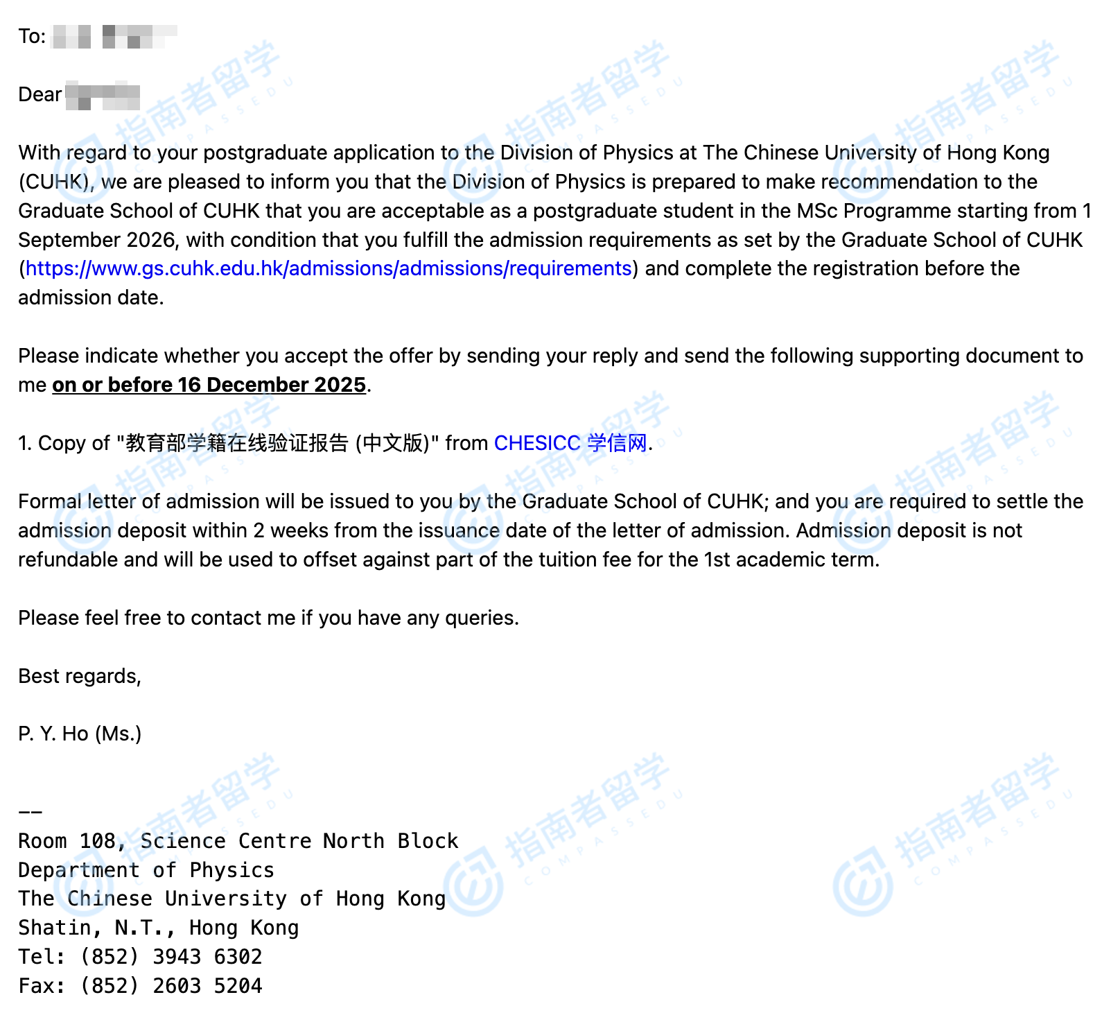 香港中文大學(xué)物理學(xué)理學(xué)碩士研究生offer一枚