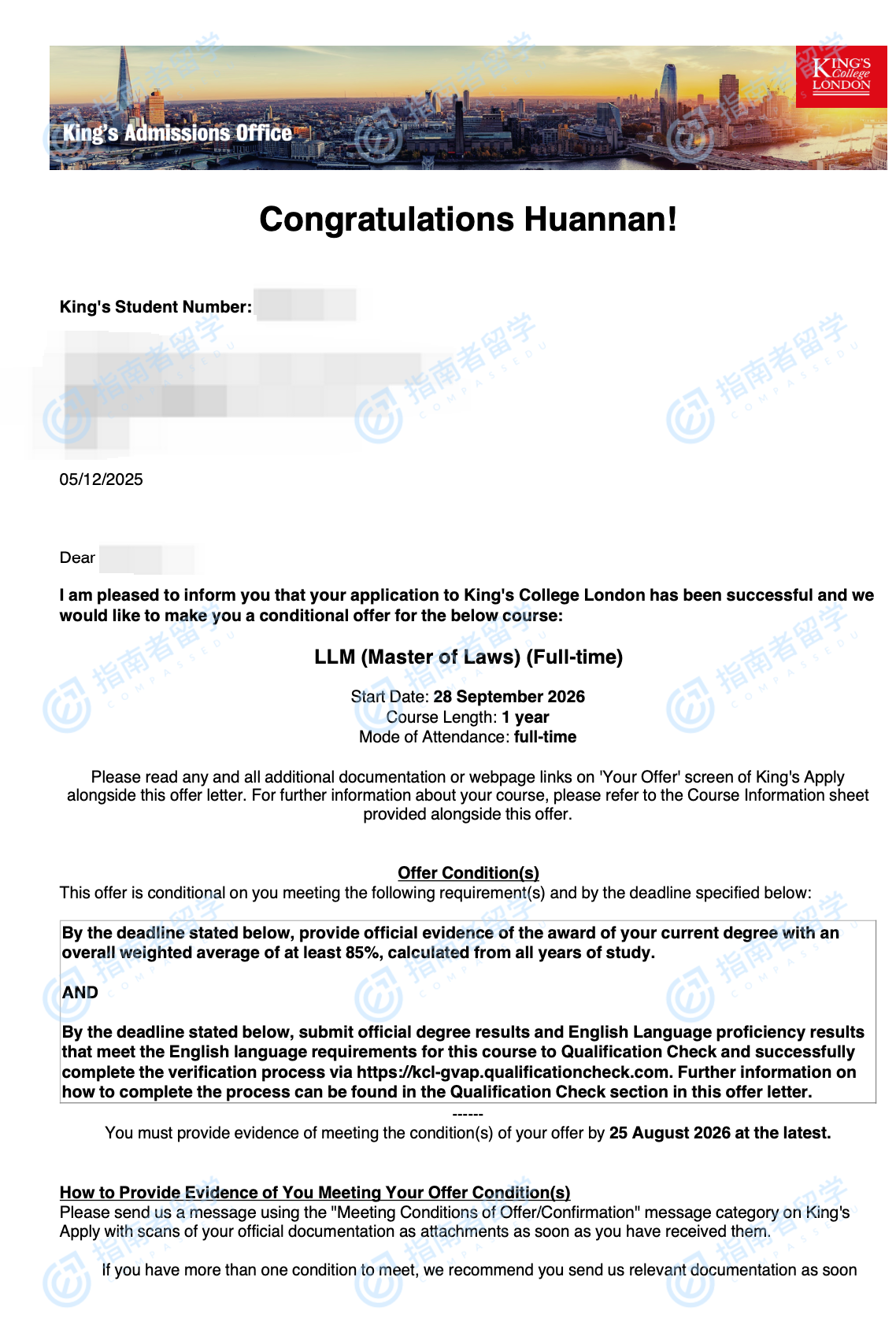 倫敦大學(xué)國王學(xué)院法學(xué)碩士研究生offer一枚