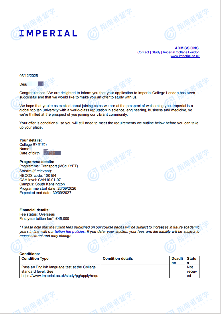 帝國(guó)理工學(xué)院運(yùn)輸理學(xué)碩士研究生offer一枚