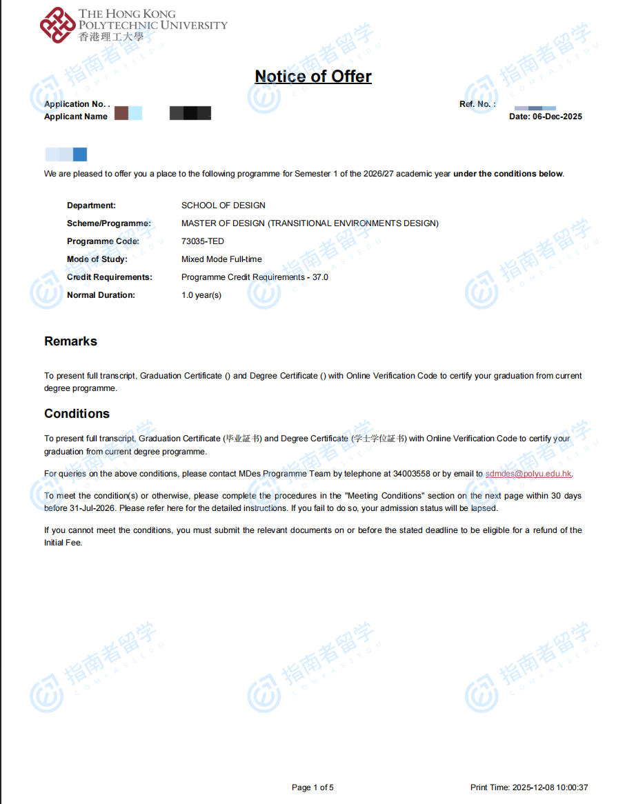 香港理工大學(xué)設(shè)計(jì)學(xué)碩士研究生offer一枚