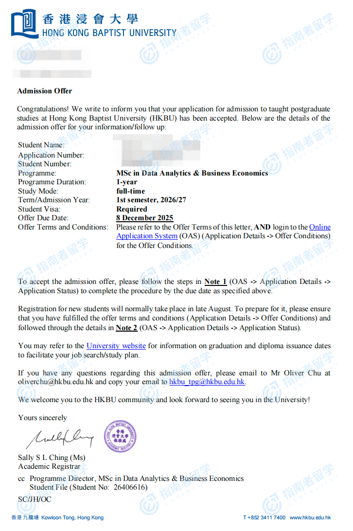 香港浸會大學數(shù)據(jù)分析與商業(yè)經(jīng)濟理學碩士研究生offer一枚