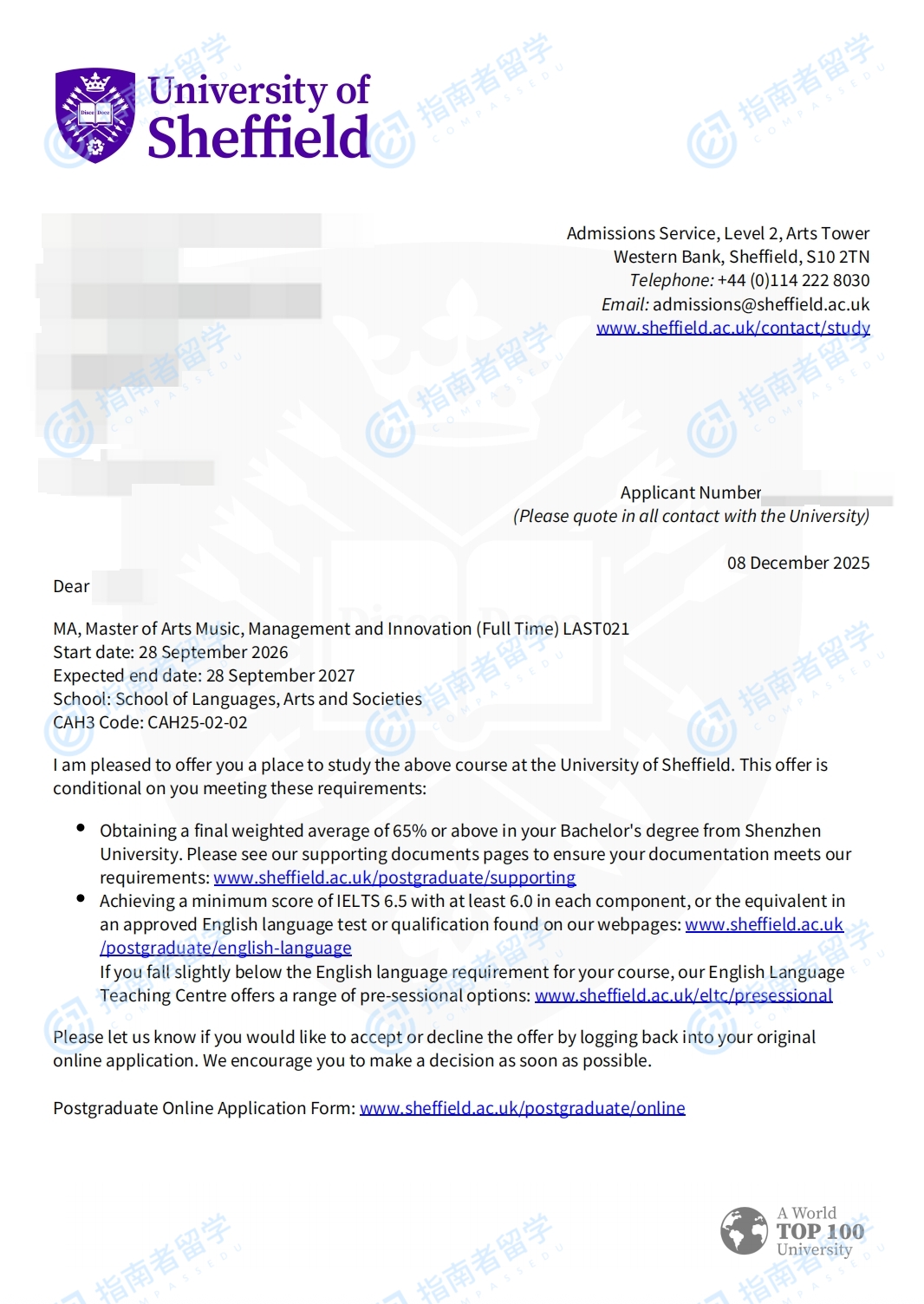 謝菲爾德大學(xué)音樂管理文學(xué)碩士研究生offer一枚