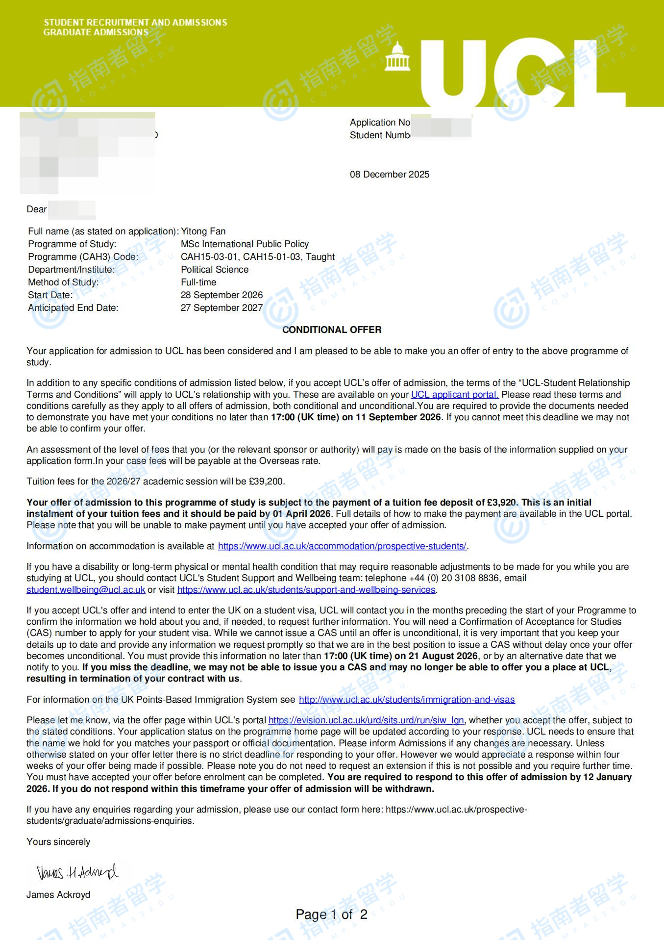 倫敦大學(xué)學(xué)院國際公共政策理學(xué)碩士研究生offer一枚