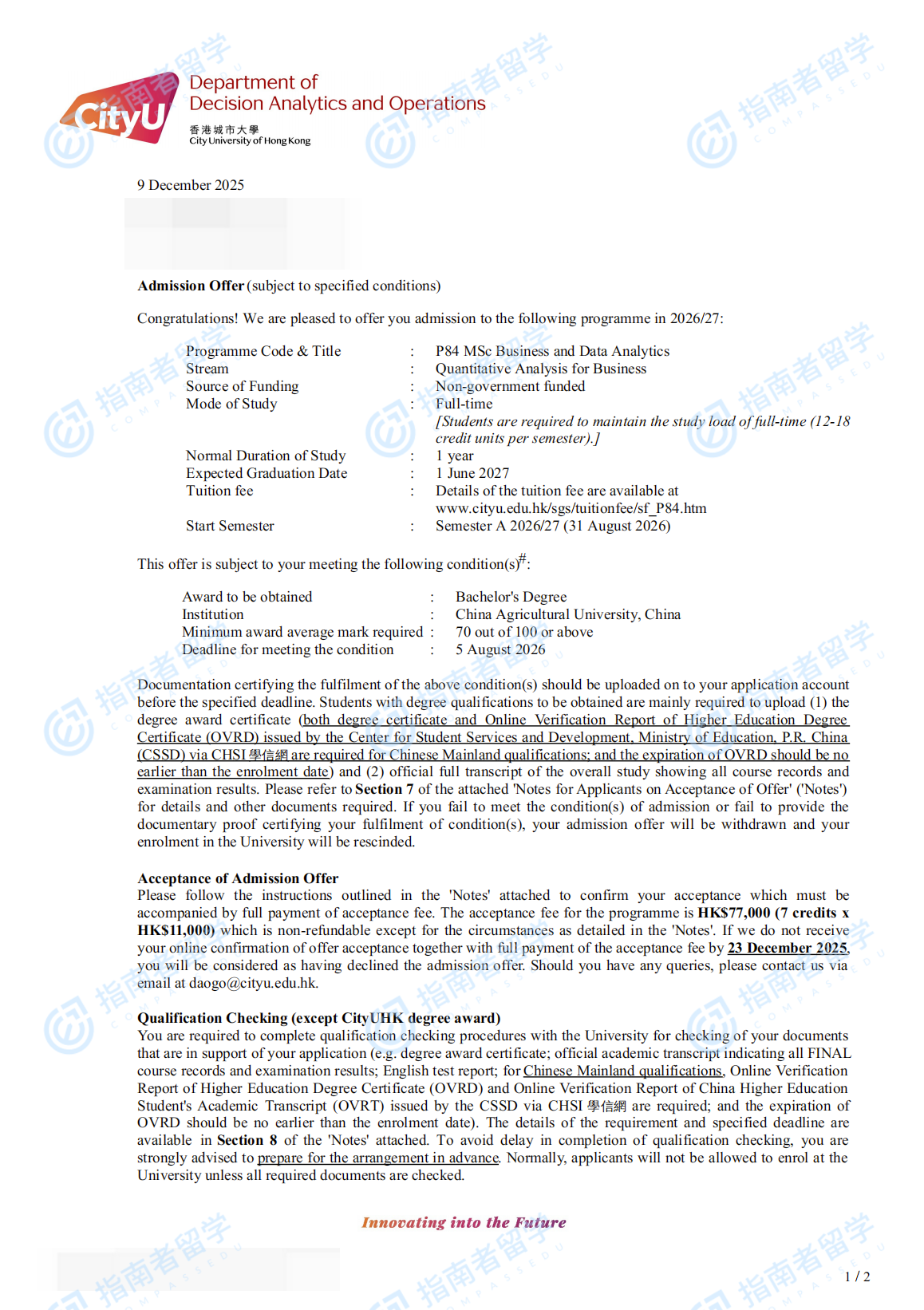 香港城市大學(xué)商業(yè)及數(shù)據(jù)分析理學(xué)碩士研究生offer一枚