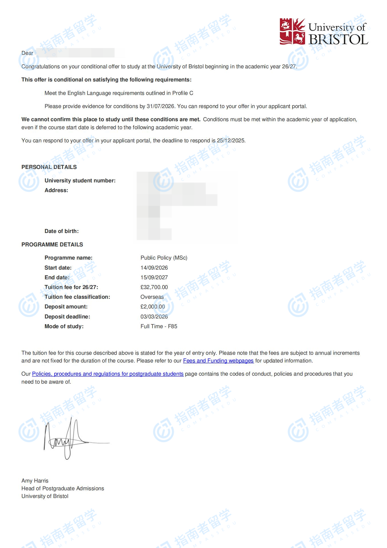 布里斯托大學(xué)公共政策理學(xué)碩士研究生offer一枚