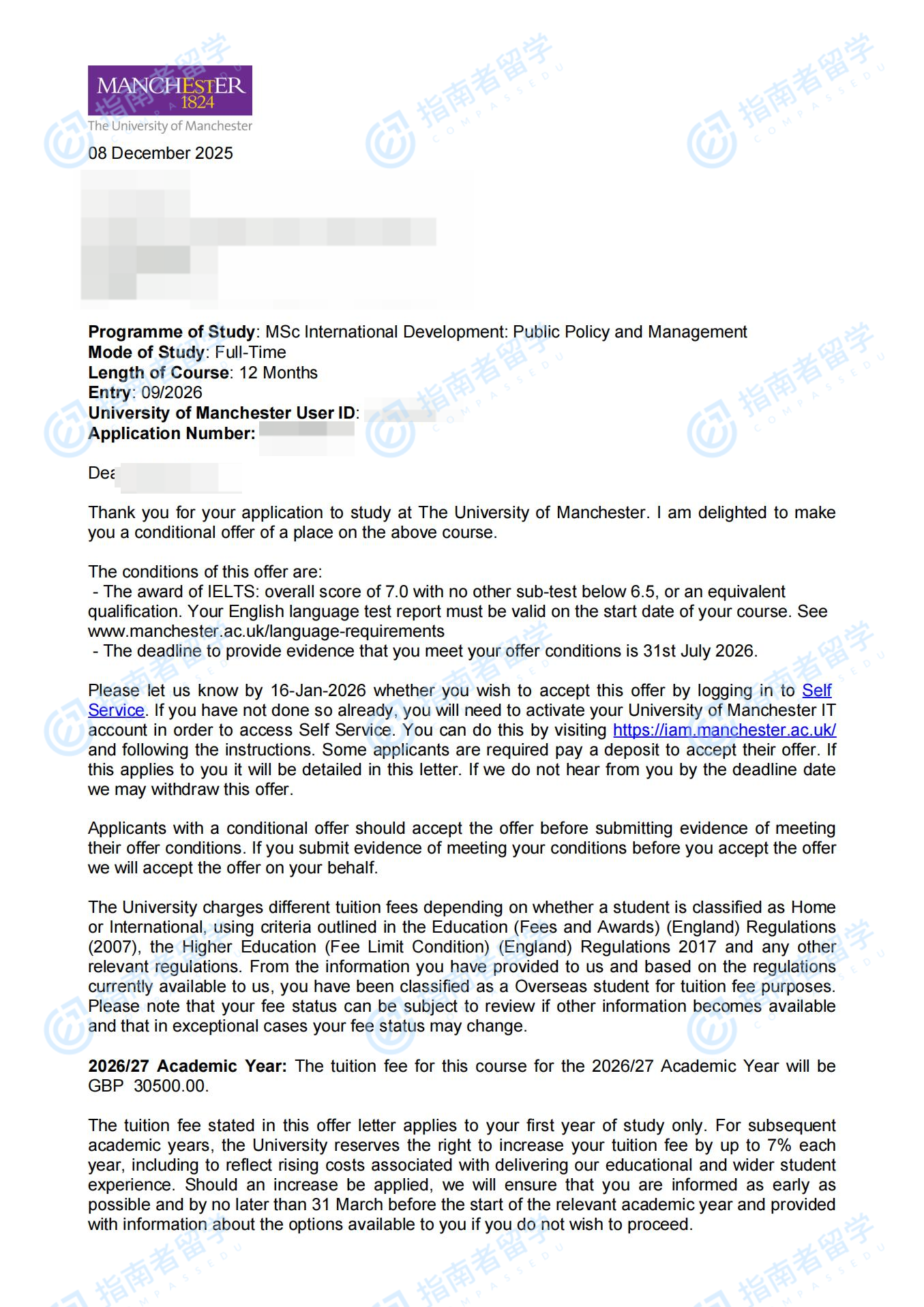 曼徹斯特大學(xué)國際發(fā)展:公共政策與管理理學(xué)碩士研究生offer一枚