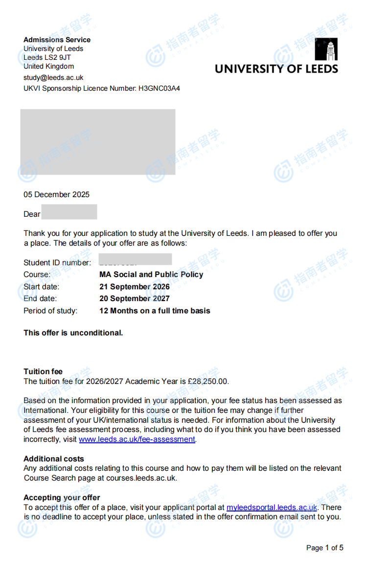 利茲大學社會與公共政策文學碩士研究生offer一枚