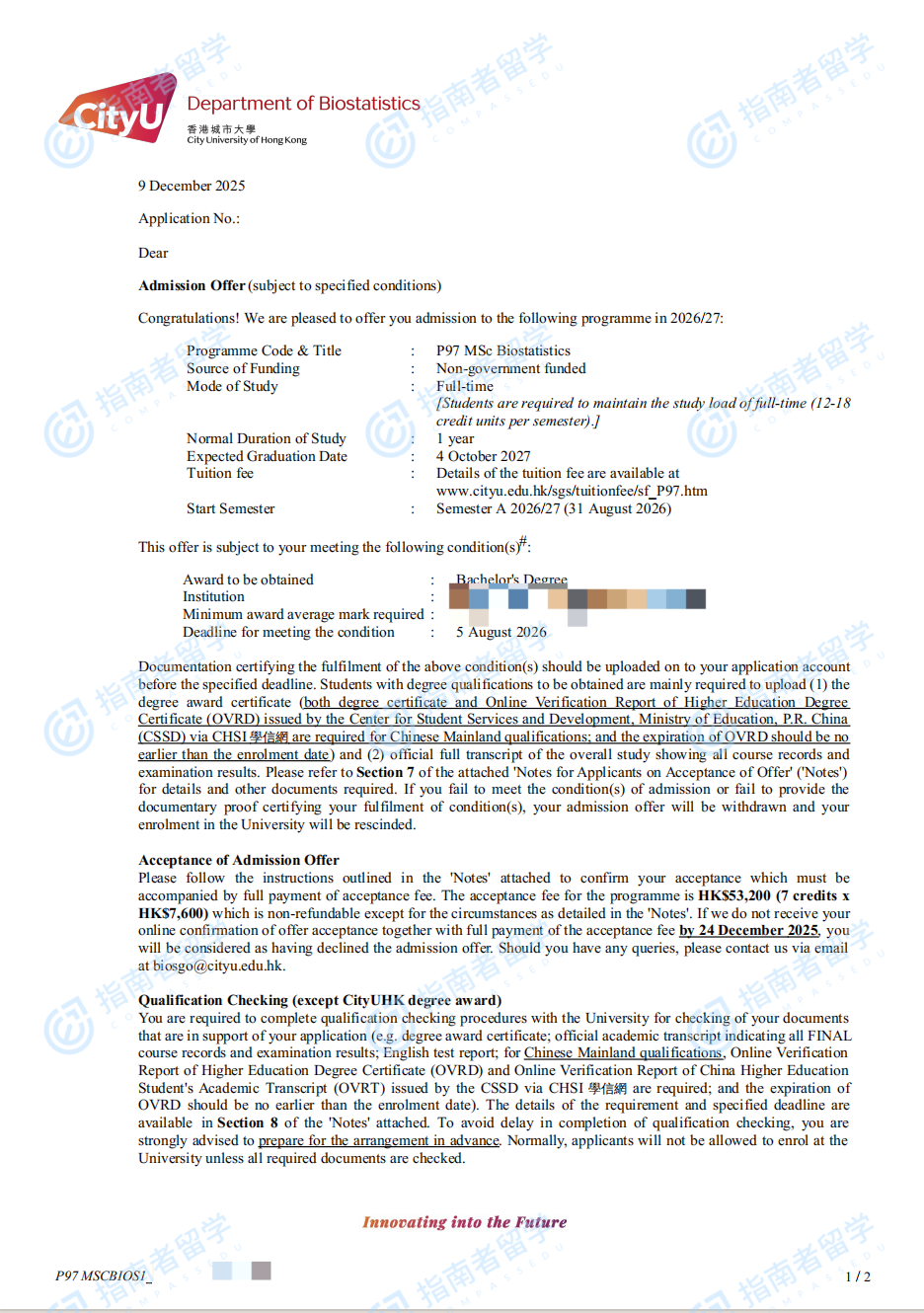 香港城市大學生物統(tǒng)計學理學碩士研究生offer一枚