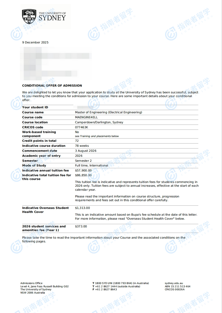 悉尼大學(xué)電氣工程工學(xué)碩士研究生offer一枚