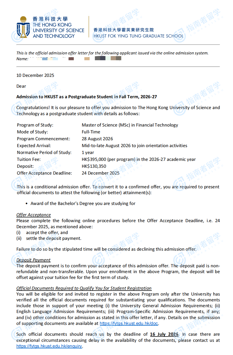 香港科技大學(xué)金融科技理學(xué)碩士研究生offer一枚