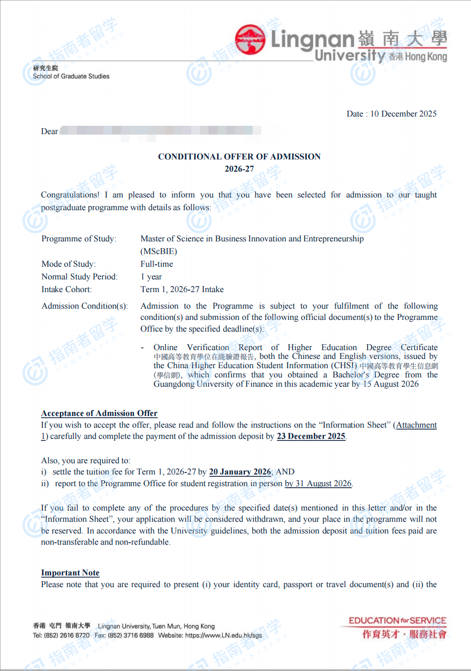 香港嶺南大學(xué)商業(yè)創(chuàng)新與創(chuàng)業(yè)理學(xué)碩士研究生offer一枚