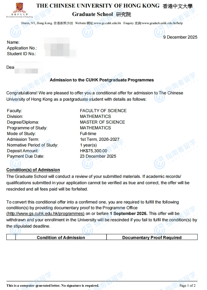 香港中文大學(xué)數(shù)學(xué)理學(xué)碩士研究生offer一枚