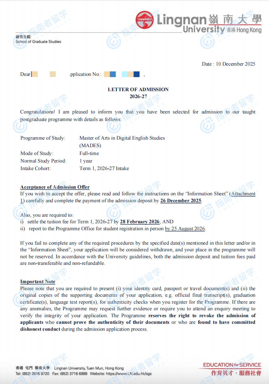 香港嶺南大學(xué)數(shù)碼英語研究文學(xué)碩士研究生offer一枚