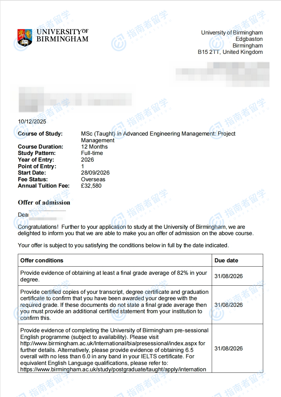 伯明翰大學(xué)高級(jí)工程管理(項(xiàng)目管理)理學(xué)碩士研究生offer一枚