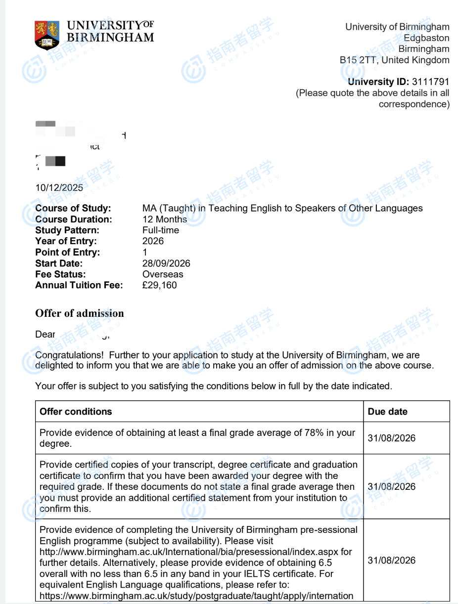 伯明翰大學(xué)對(duì)外英語(yǔ)教學(xué)文學(xué)碩士研究生offer一枚