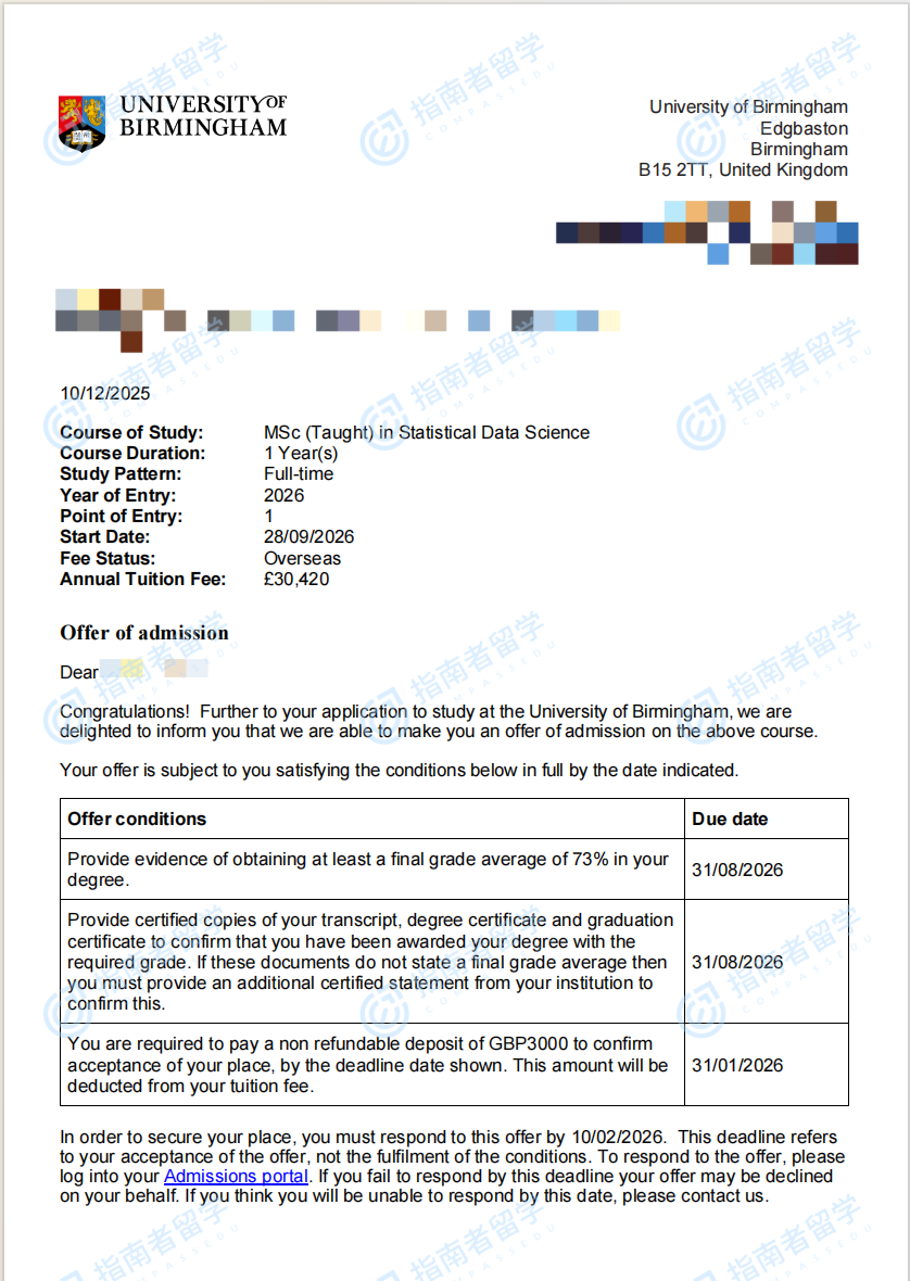 伯明翰大學(xué)統(tǒng)計數(shù)據(jù)科學(xué)理學(xué)碩士研究生offer一枚