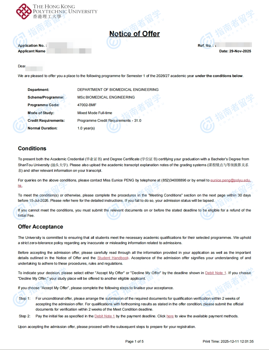 香港理工大學(xué)生物醫(yī)學(xué)工程理學(xué)碩士研究生offer一枚