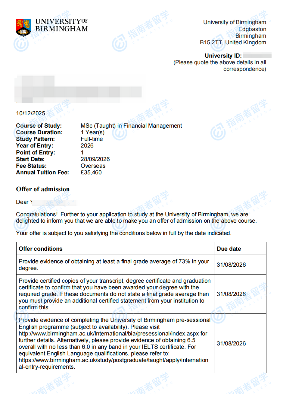 伯明翰大學(xué)財(cái)務(wù)管理理學(xué)碩士研究生offer一枚