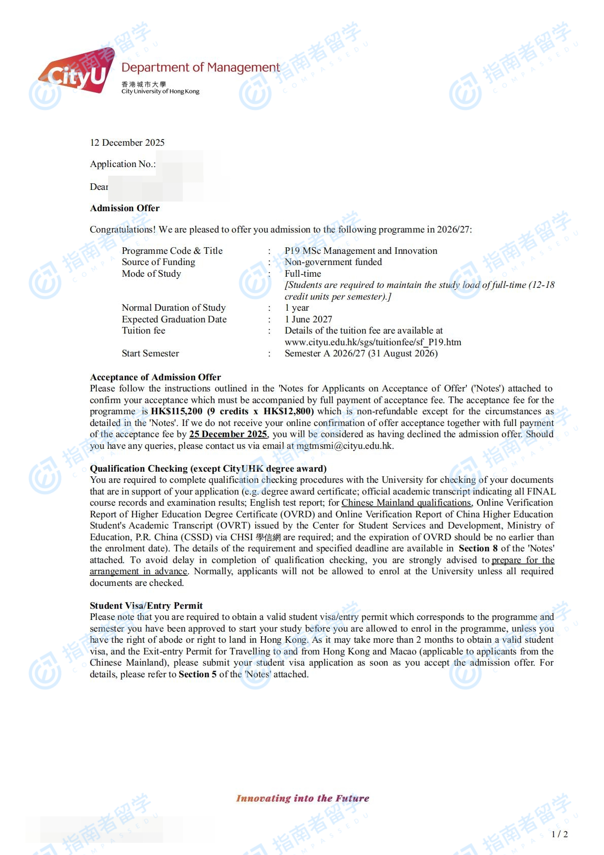香港城市大學管理與創(chuàng)新理學碩士研究生offer一枚