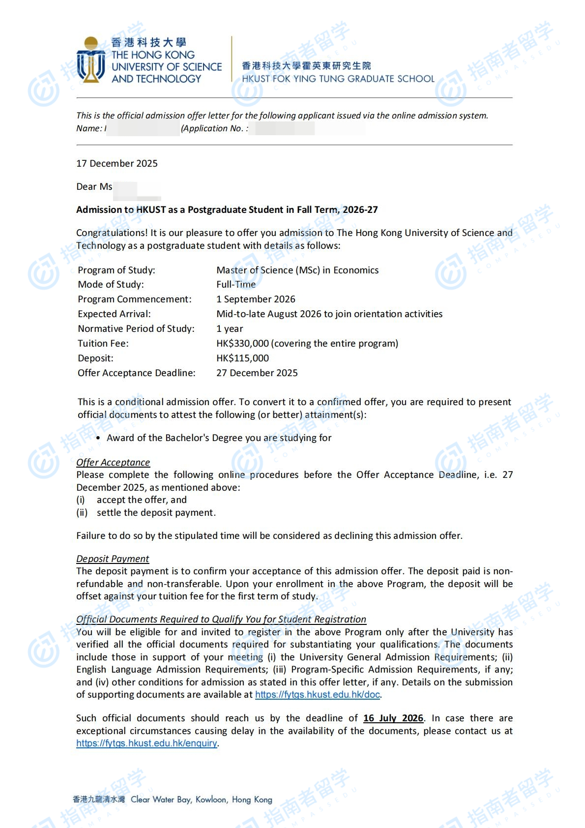 香港科技大學(xué)經(jīng)濟學(xué)理學(xué)碩士研究生offer一枚
