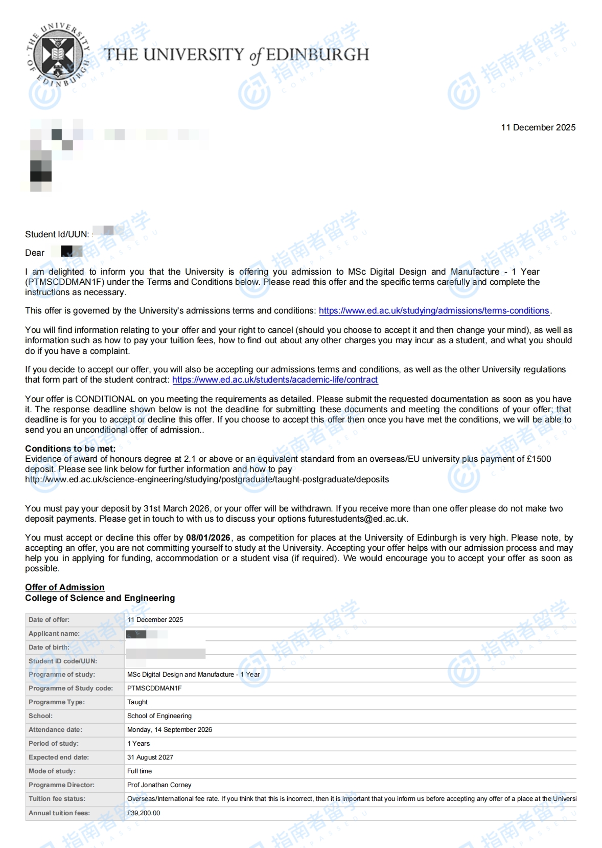 愛丁堡大學(xué)數(shù)字化設(shè)計與制造理學(xué)碩士研究生offer一枚