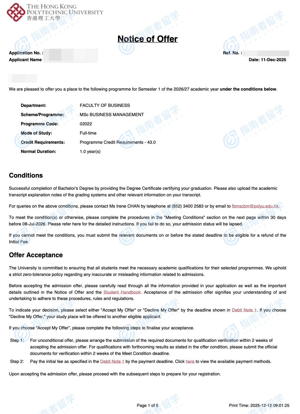 香港理工大學商業(yè)管理理學碩士研究生offer一枚