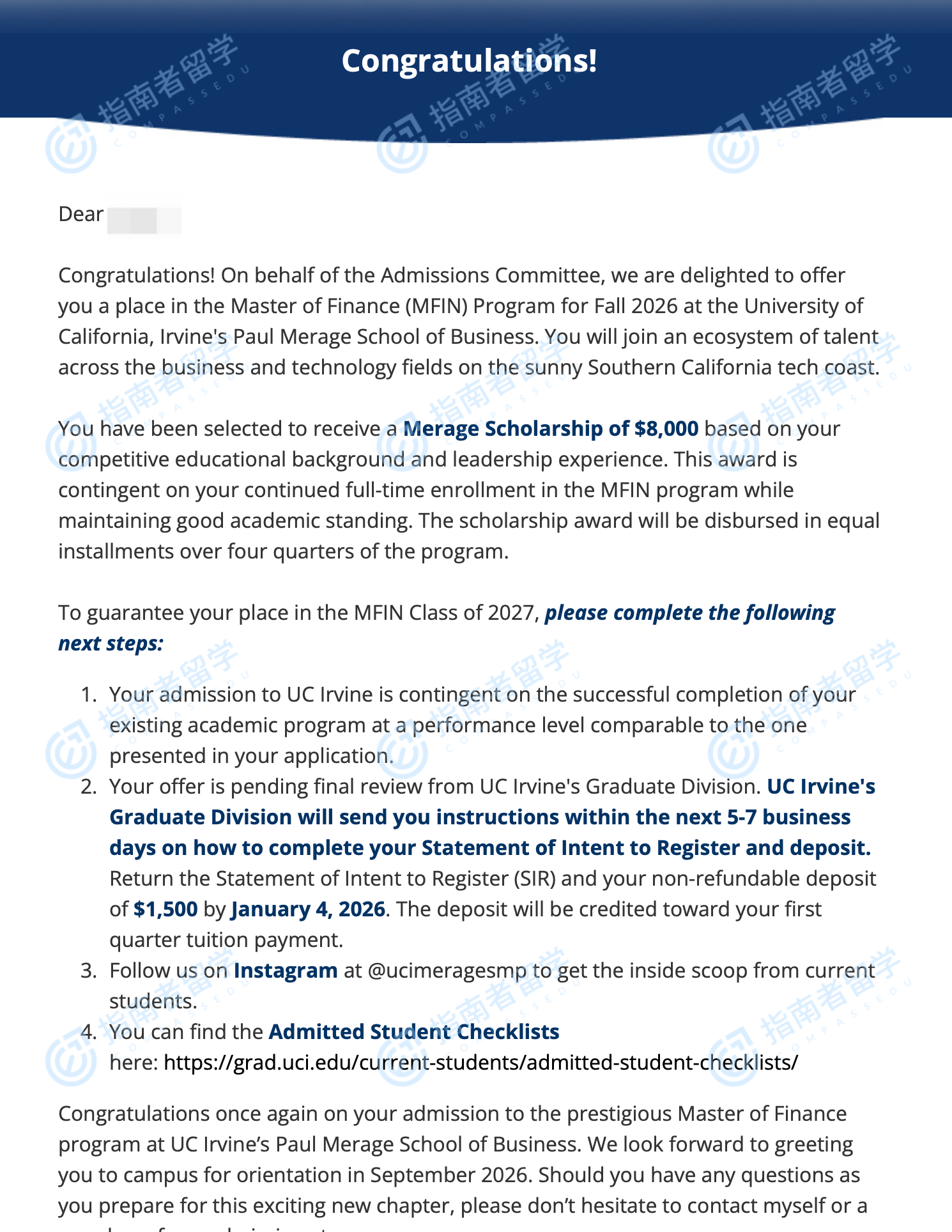 加州大學(xué)歐文分校金融碩士研究生offer一枚