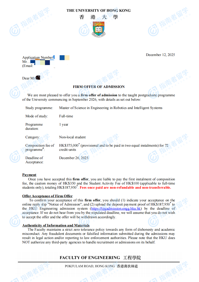 香港大學(xué)機(jī)器人與智能系統(tǒng)(工程)理學(xué)碩士研究生offer一枚