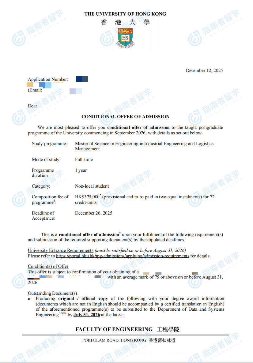 香港大學(xué)工業(yè)工程與物流管理(工程)理學(xué)碩士研究生offer一枚