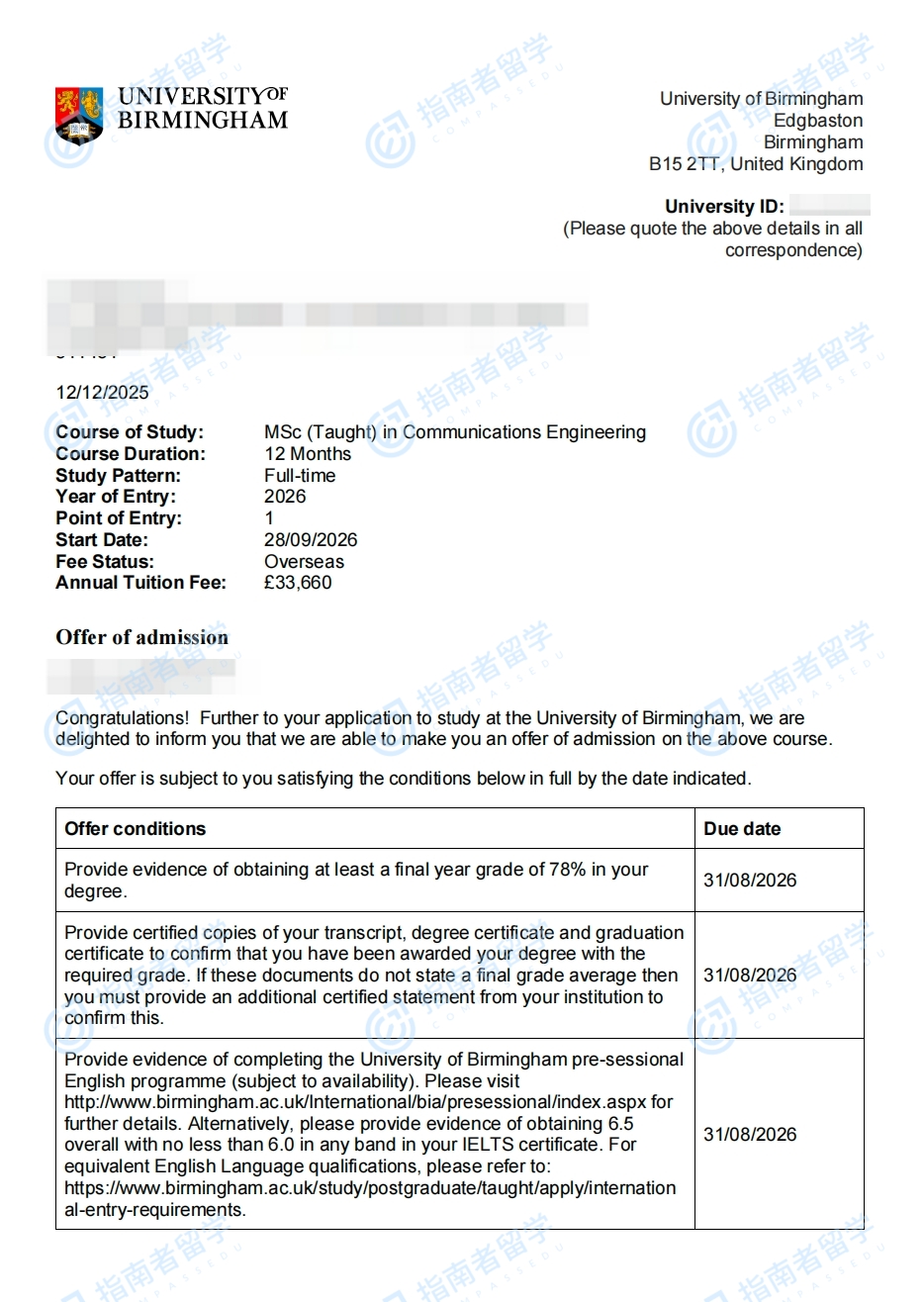 伯明翰大學通信工程理學碩士研究生offer一枚
