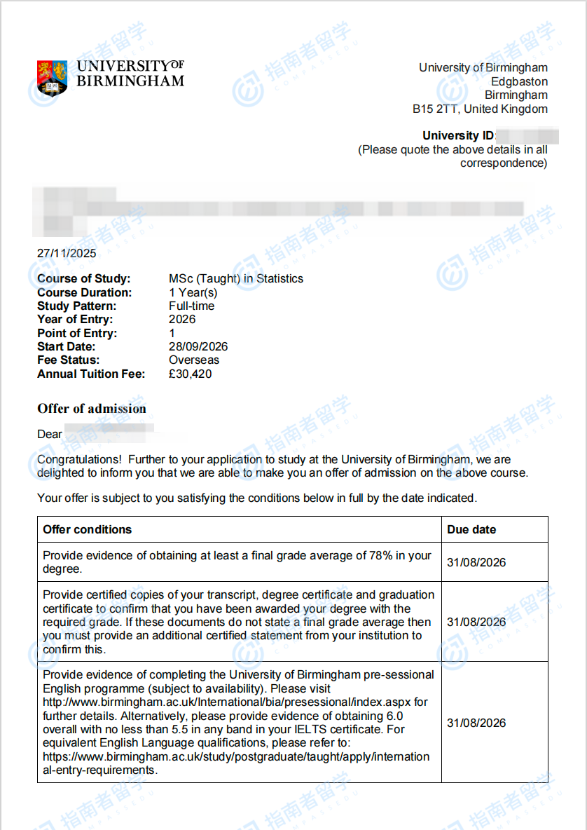 伯明翰大學(xué)統(tǒng)計(jì)學(xué)理學(xué)碩士研究生offer一枚