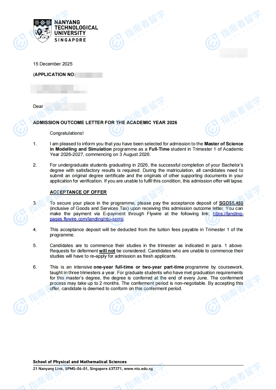 南洋理工大學(xué)建模與仿真理學(xué)碩士研究生offer一枚