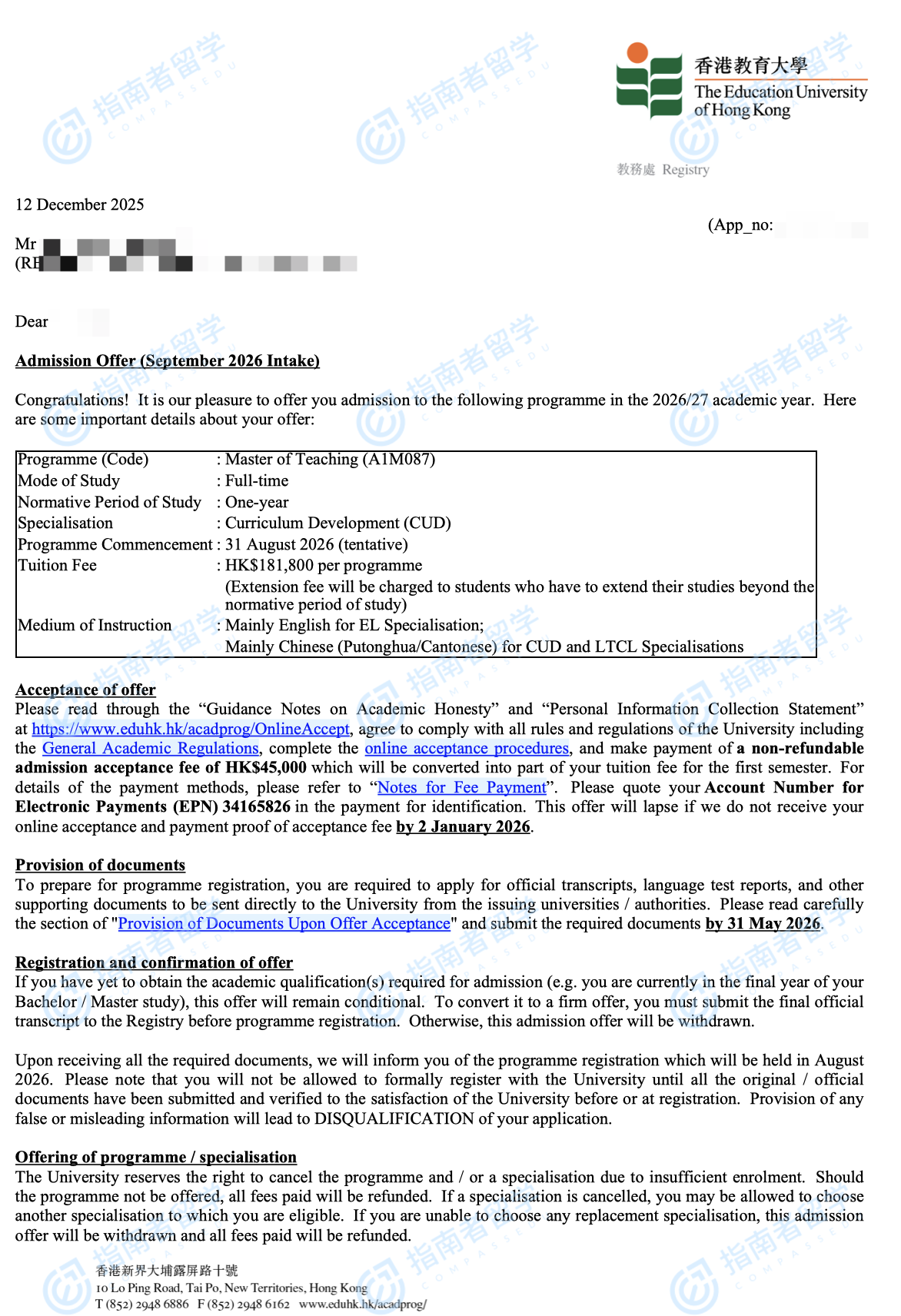 香港教育大學(xué)教學(xué)碩士研究生offer一枚