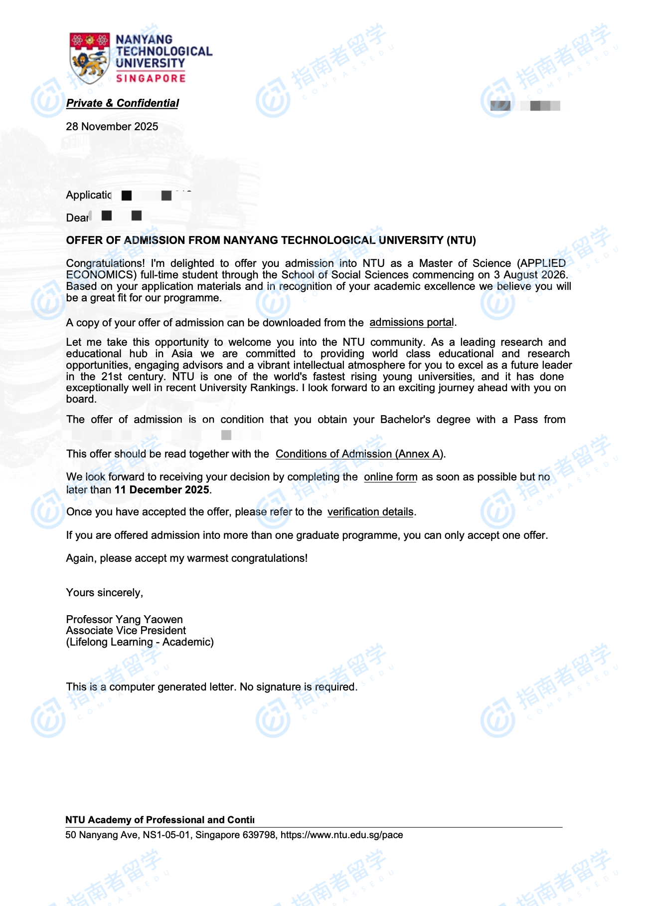 南洋理工大學應用經濟學理學碩士研究生offer一枚