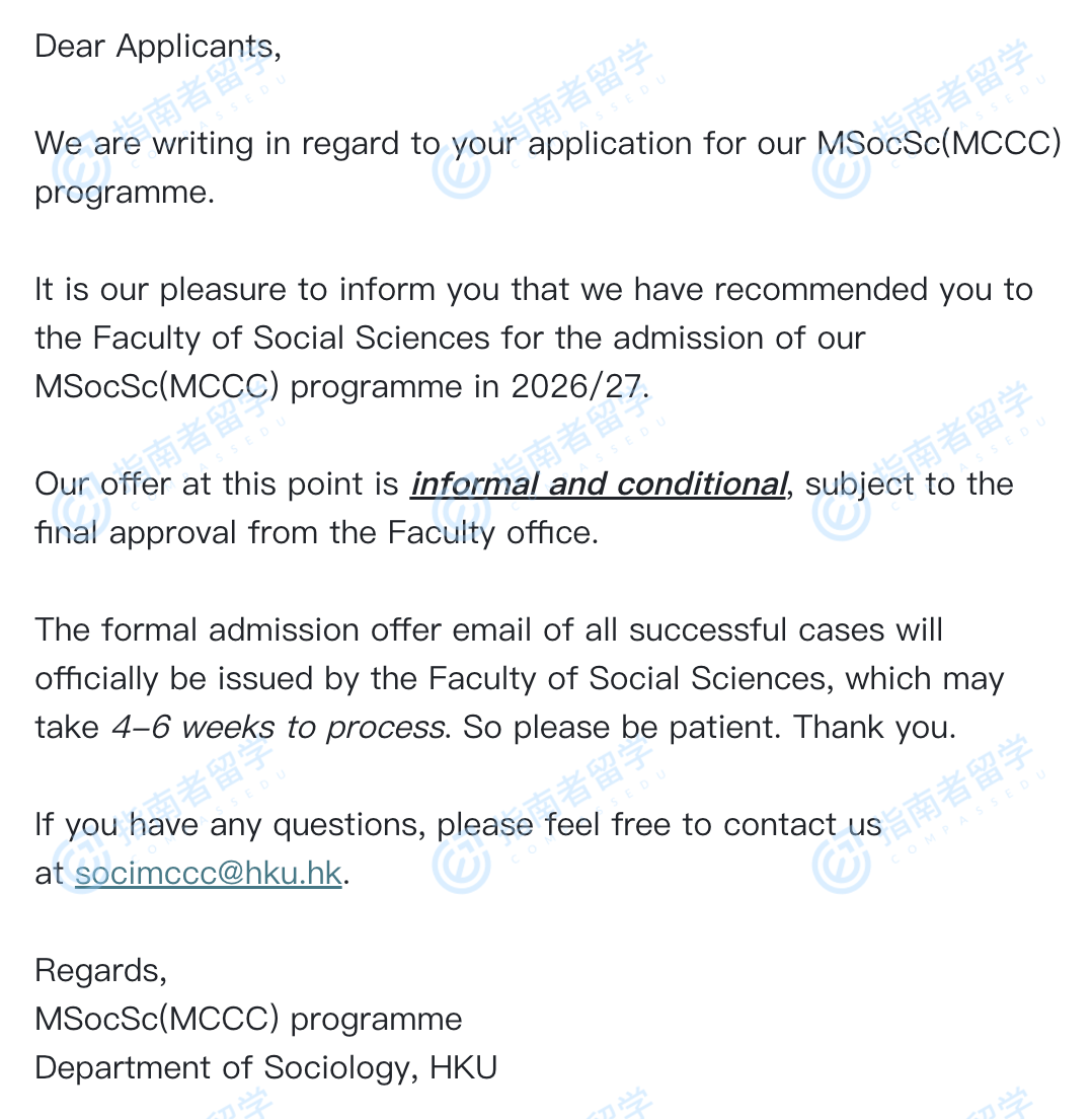 香港大學(xué)媒體、文化與創(chuàng)意城市社會科學(xué)碩士研究生offer一枚