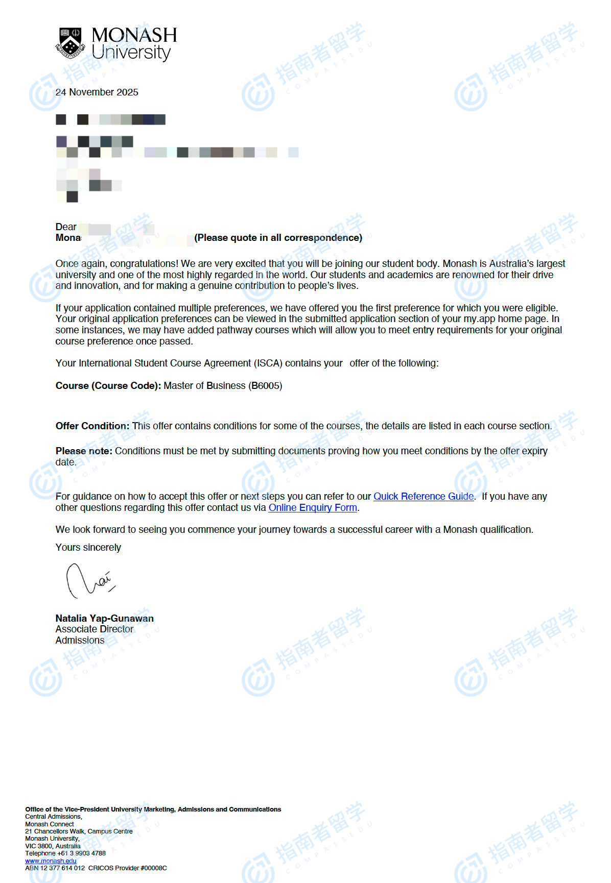 昆士蘭大學商業(yè)碩士(2年制)研究生offer一枚