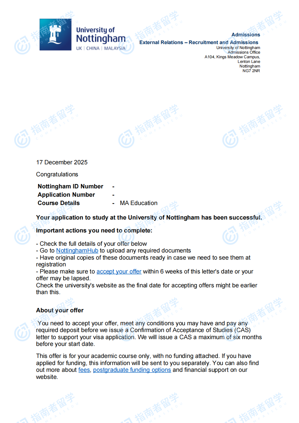 諾丁漢大學(xué)教育學(xué)文學(xué)碩士研究生offer一枚