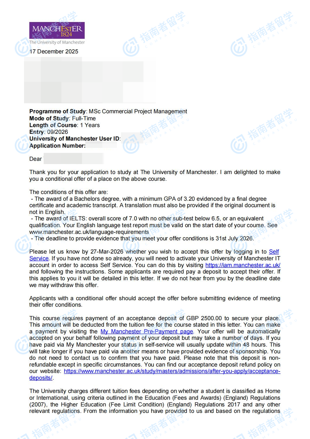 曼徹斯特大學(xué)商業(yè)項(xiàng)目管理理學(xué)碩士研究生offer一枚