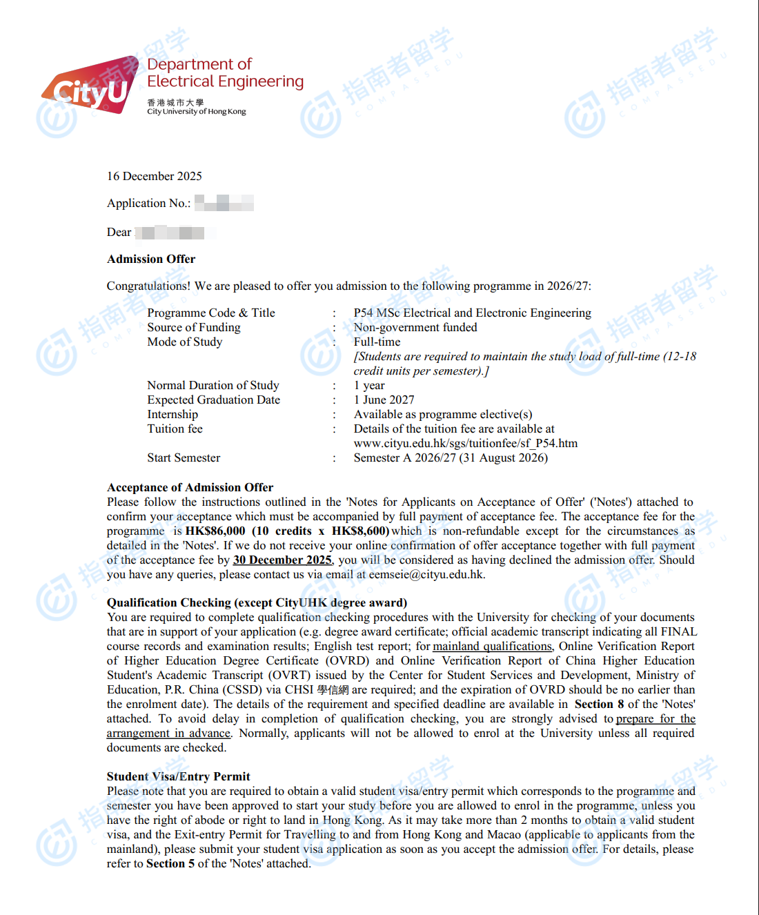 香港城市大學(xué)電機與電子工程學(xué)理學(xué)碩士研究生offer一枚
