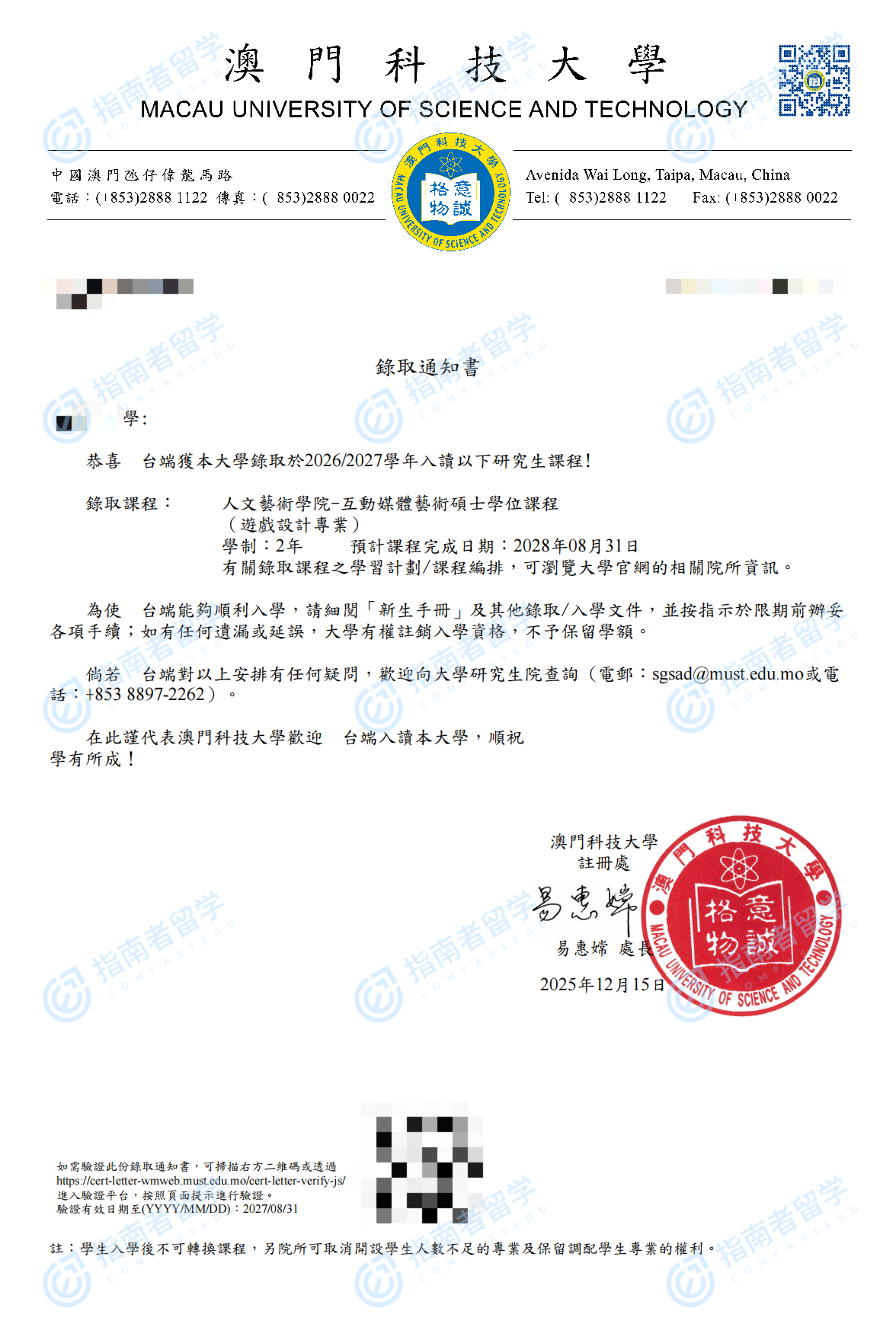 澳門科技大學(xué)互動(dòng)媒體藝術(shù)碩士研究生offer一枚