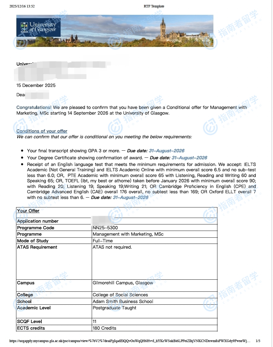 格拉斯哥大學(xué)管理學(xué)理學(xué)碩士(市場(chǎng)營(yíng)銷)研究生offer一枚