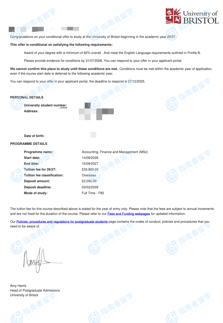 布里斯托大學(xué)會計、金融與管理理學(xué)碩士研究生offer一枚