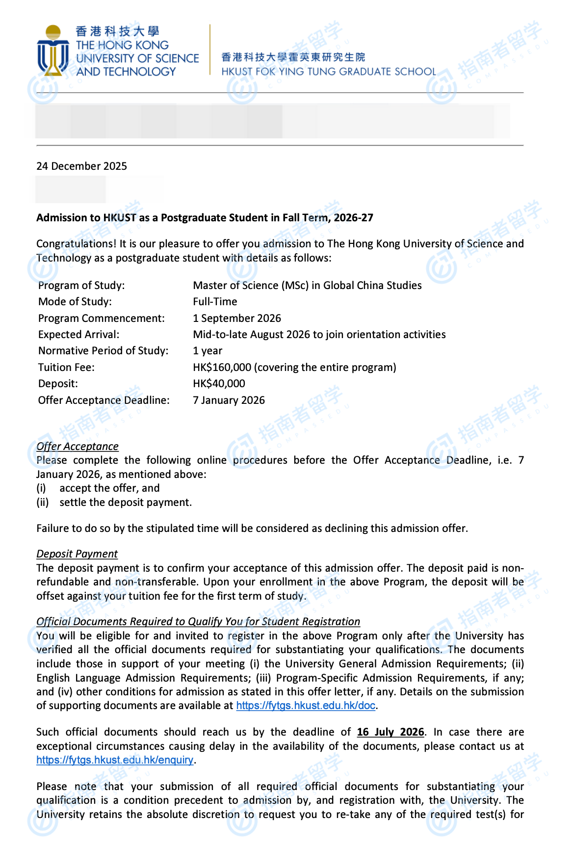 香港科技大學(xué)全球中國(guó)研究理學(xué)碩士研究生offer一枚