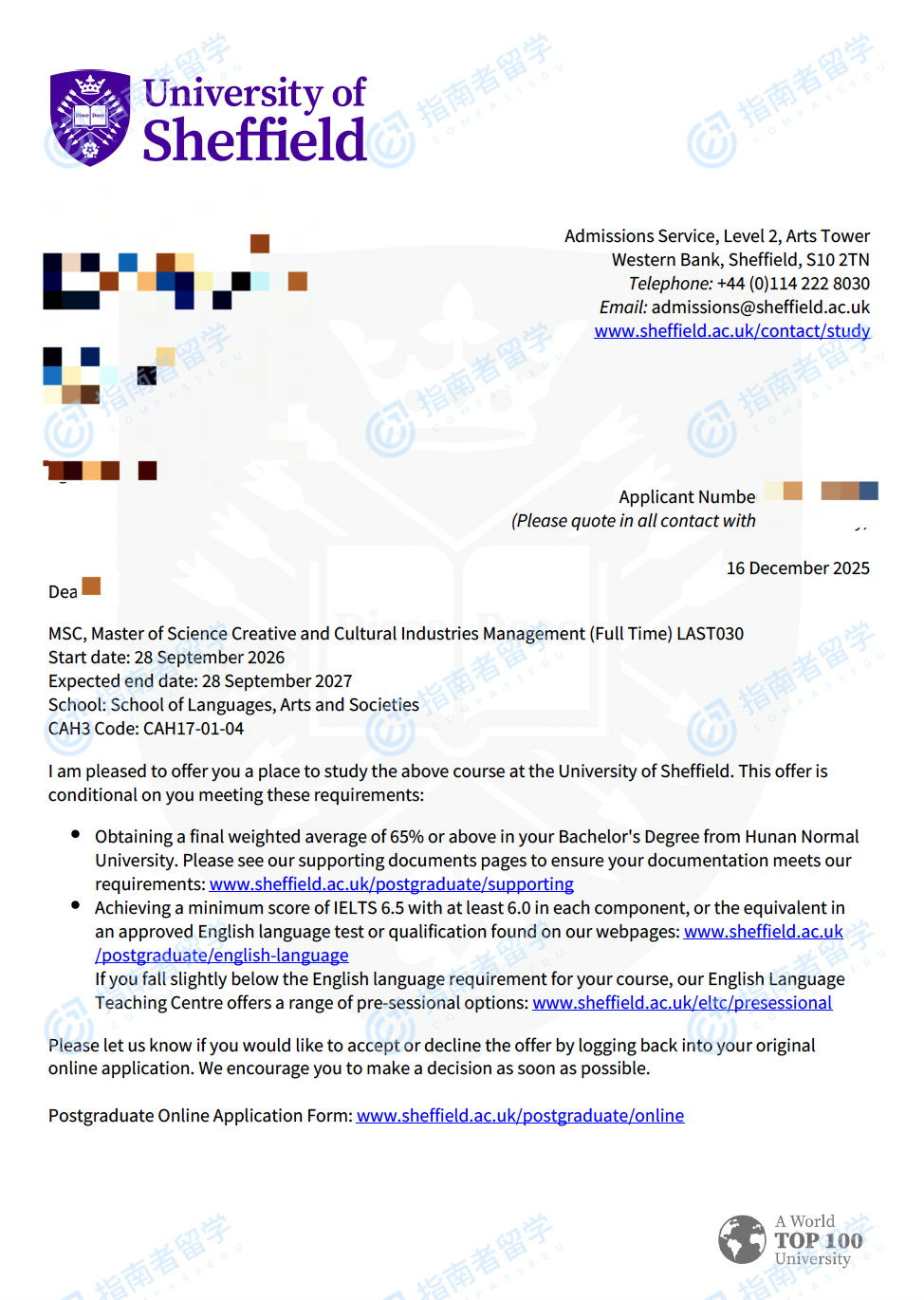謝菲爾德大學創(chuàng)意與文化產(chǎn)業(yè)管理理學碩士研究生offer一枚