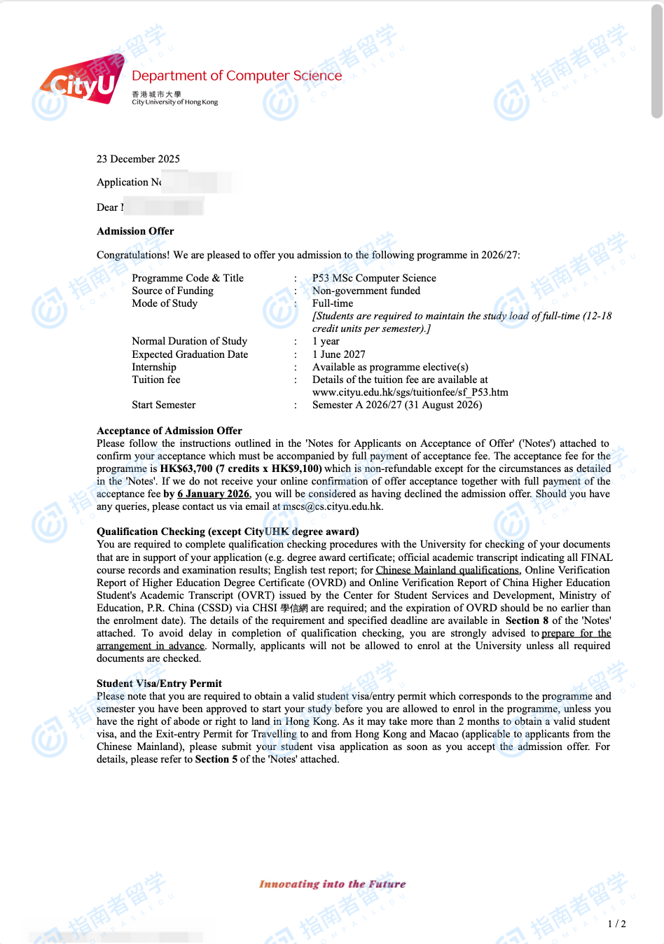香港城市大學計算機科學理學碩士研究生offer一枚