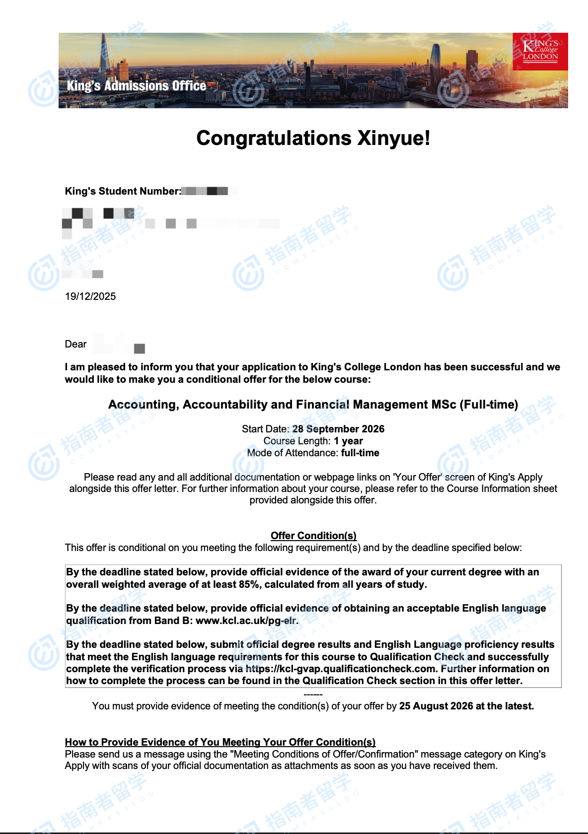 倫敦大學(xué)國王學(xué)院會計、問責(zé)與財務(wù)管理理學(xué)碩士研究生offer一枚