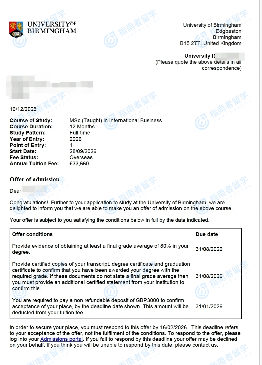 伯明翰大學(xué)國際商務(wù)理學(xué)碩士研究生offer一枚