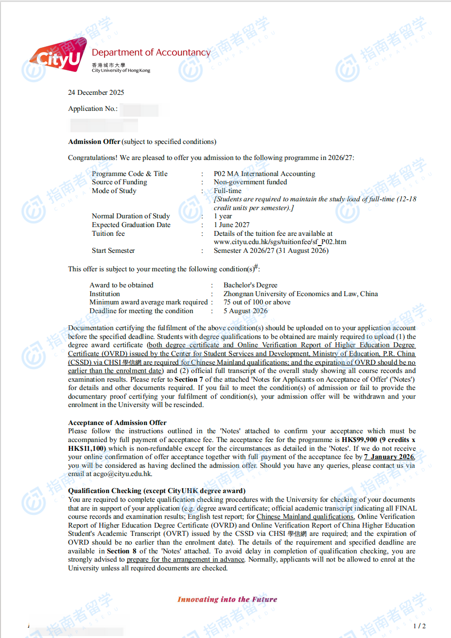 香港城市大學國際會計學文學碩士研究生offer一枚