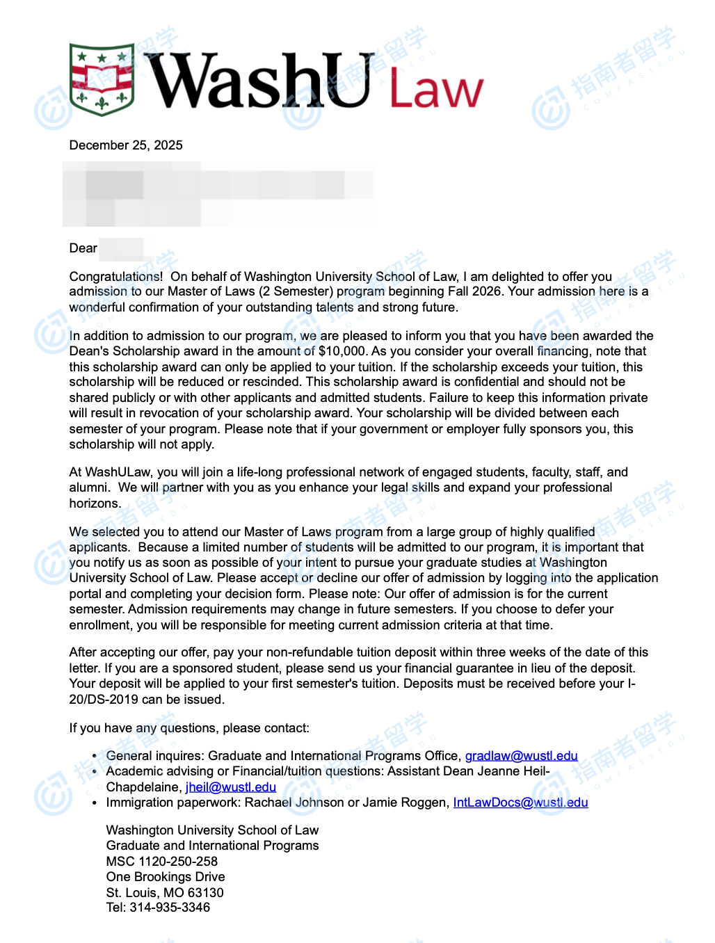 圣路易斯華盛頓大學(xué)法學(xué)碩士研究生offer一枚