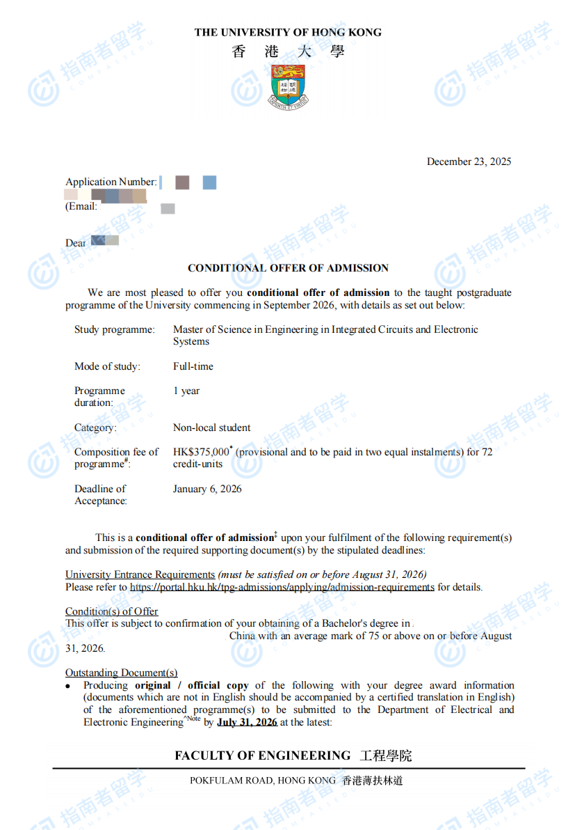 香港大學(xué)電氣與電子工程(工程)理學(xué)碩士 - 常規(guī)方向研究生offer一枚